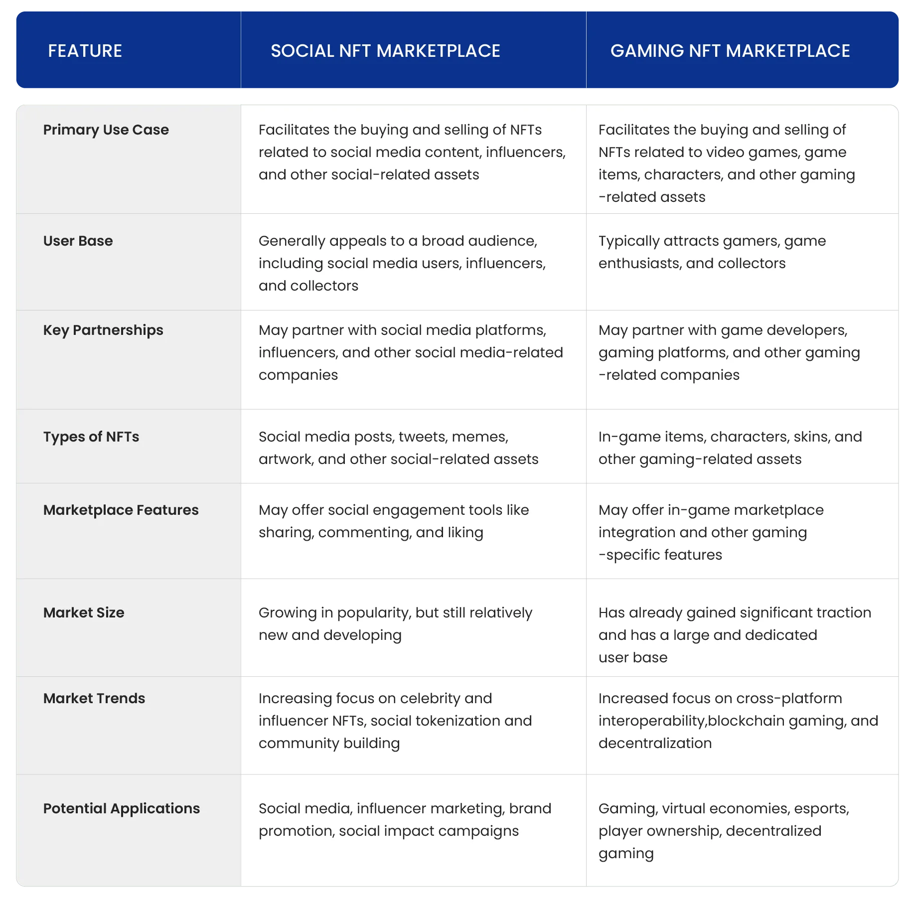 Social NFT marketplaces appeal to a wide range of individuals, including social media consumers, influencers, and collectors. Gaming NFT marketplaces, on the other hand, typically attract gamers, game enthusiasts, and aficionados.