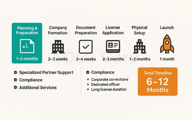 The application process typically takes 2-3 months from submission to approval, assuming all documentation is complete and accurate. The entire process from company formation to license issuance can take 4-6 months. Working with experienced consultants can help streamline the process.