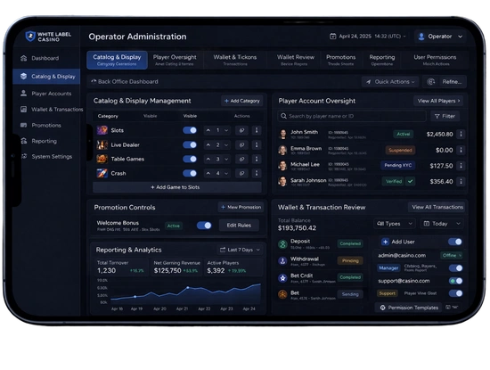 Operators can use the day-to-day admin areas included in the white label casino software for routine oversight, operational monitoring, and controlled management across the main activity areas.