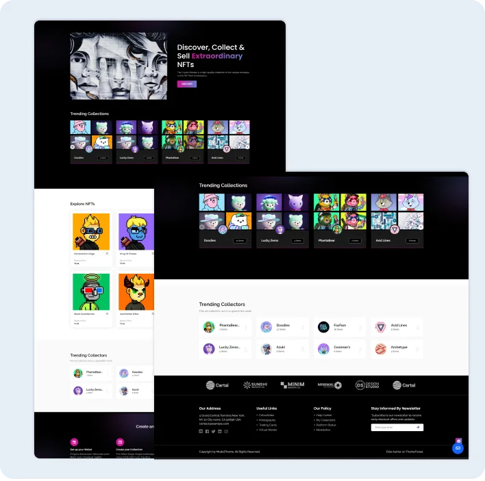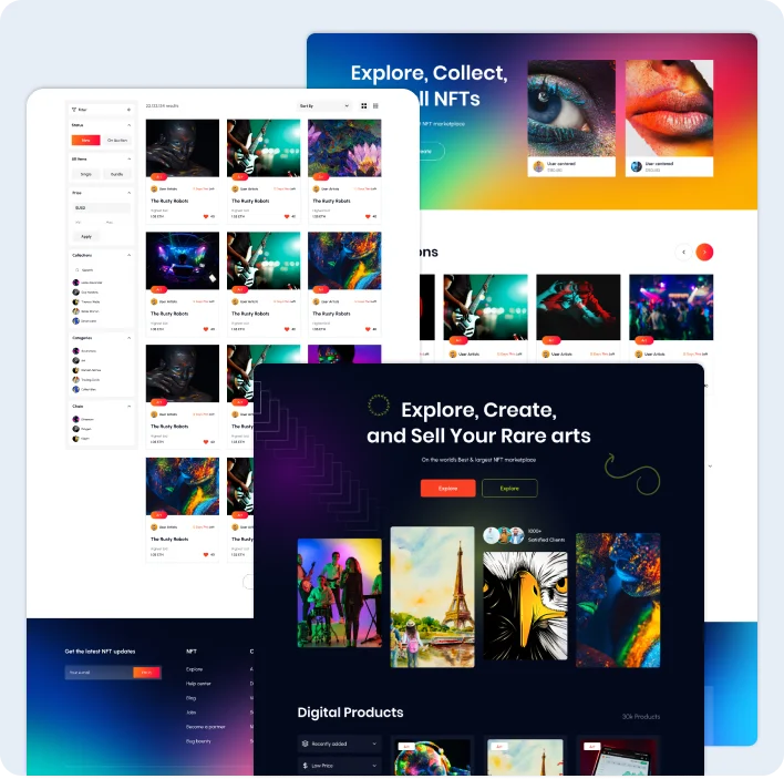 Our company provides comprehensive NFT marketplace services, enabling users to launch feature-packed NFT marketplaces on various Blockchain Networks such as Ethereum, Avalanche, and Polkadot. Our offerings encompass various functionalities, including NFT creation, storefront exploration, wallet integration, bid placement, and secure NFT storage solutions.